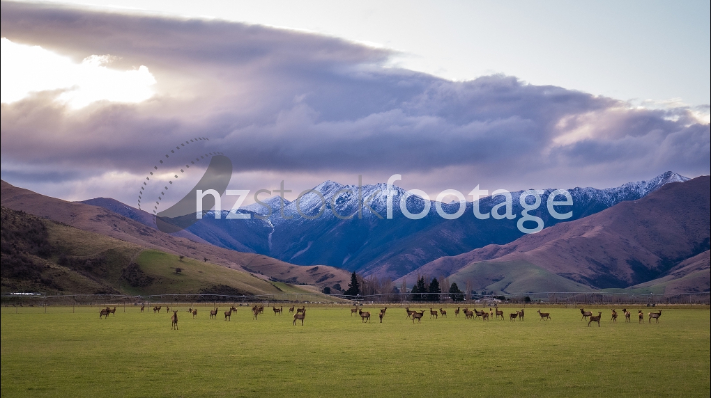 Herd of Deer in paddock with snowy mountains in background