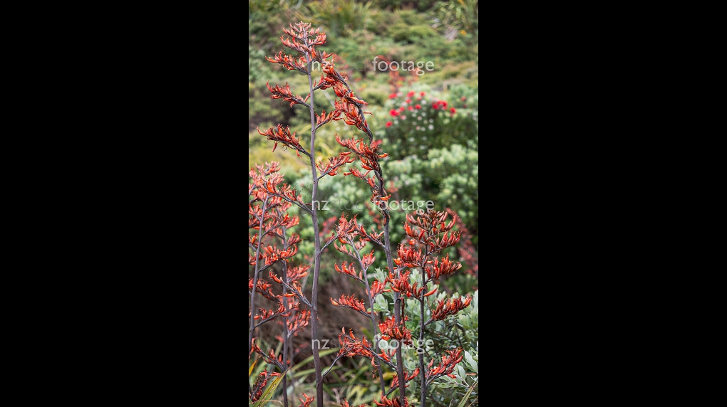 Harakeke flax plant in flower with Pōhutukawa tree in foreground