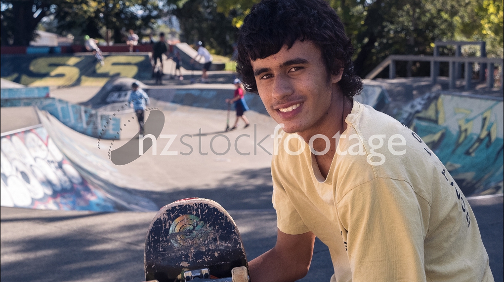 Young Maori skateboarder portrait in skate park